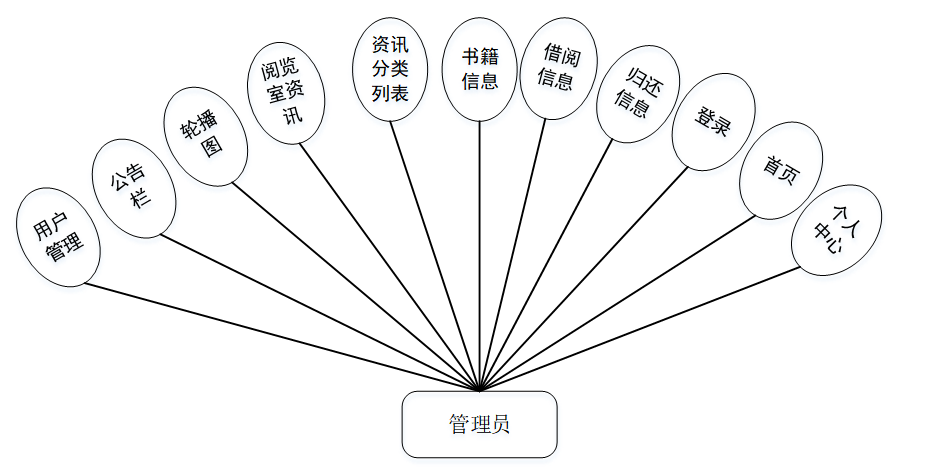 基于校自助阅览室的设计基于现有的手机,可以实现管理员,用户管理、阅览室资讯、资讯分类列表、书籍信息、借阅信息、归还信息等详细的了解及统计分析。根据系统功能需求建立的模块关系图如下图: