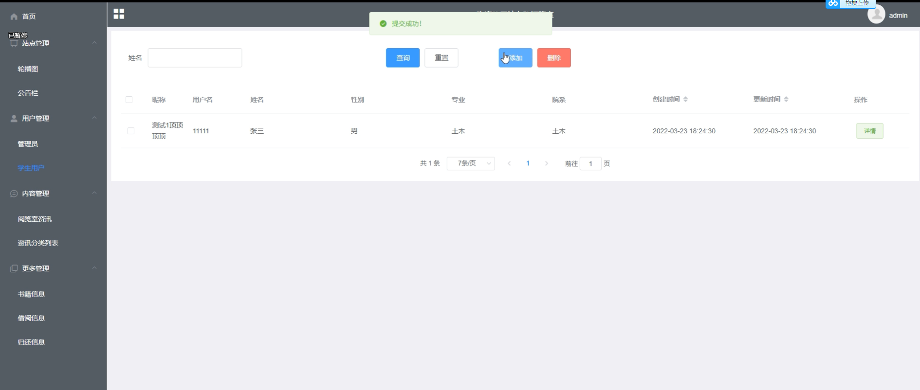 | 进入书籍信息界面,点击“录入”按钮,填写所有必填项,点击提交 | 提示“录入成功”,并返回查询界面 | 一致 | |