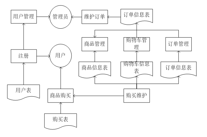 业务流程图(TFD)通过一些特定的符号描述业务的处理过程,它重点强调业务过程中每一项处理活动和具体业务部门的关系,选择部分模块进行具体描述。重点对本系统整体业务中最为主要的商品交易及订单业务进行描述,用户进入绿树成荫后进行各种模块信息的浏览,选择想要购买的商品添加到购物车,用户到购物车进行所购商品查询并确认购买、填写订单信息,另外,管理人员进入后端管理,以执行该订单信息控制模块的相关管理方法,并在解决后向客户提供反馈机制。