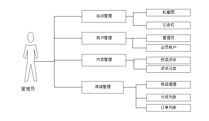 管理员登录后可进行首页、站点管理(轮播图、公告栏)用户管理(管理员、会员用户)内容管理(热卖资讯、资讯分类列表)商城管理(商品管理、分类列表、订单列表),管理员的用例如图3-1所示。