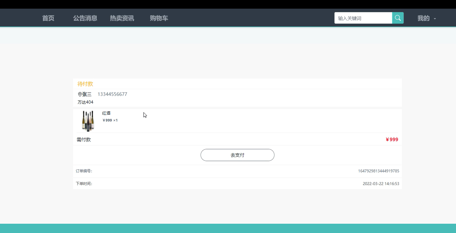 订单管理:通过商城页面,我的收藏,可以获取收藏名称、收藏图片,提交订购数、联系方式、收货地址信息下单如图5-3所示。