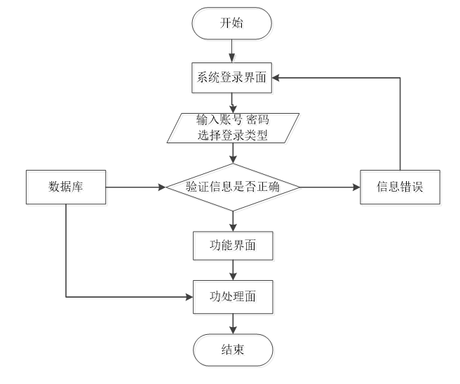 用户想进入系统,首先进入系统登录界面,通过正确的用户名、密码,选择登录类型登录,系统会检查登录信息,信息正确,然后输入相应的功能界面,提示信息错误,登录失败。系统操作流程如图3-4所示。