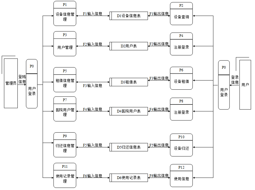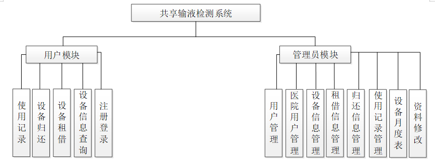 共享输液检测系统的功能主要分为前台用户根据自己的需求进行注册登录,浏览设备信息。而管理员主要对注册用户,设备信息数据,租借信息,归还信息,使用记录,进行管理。