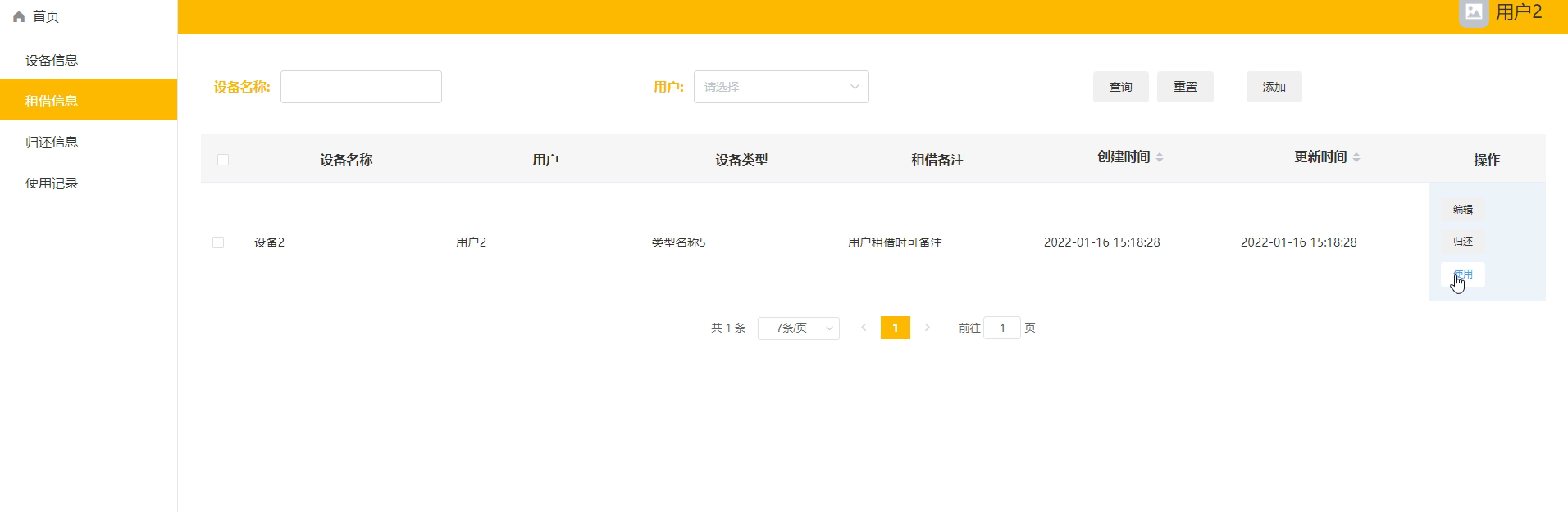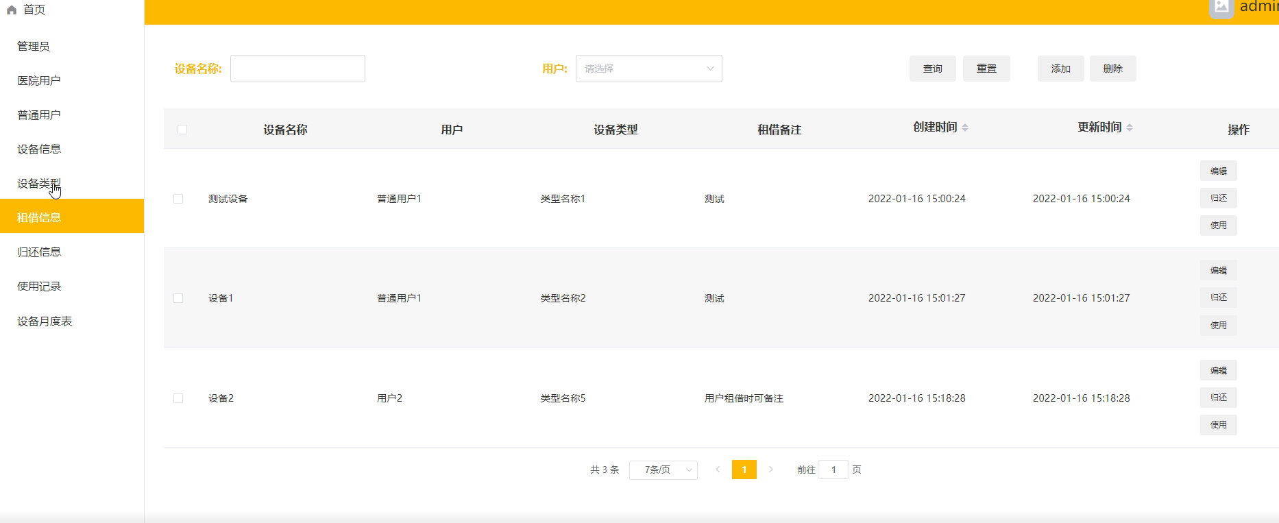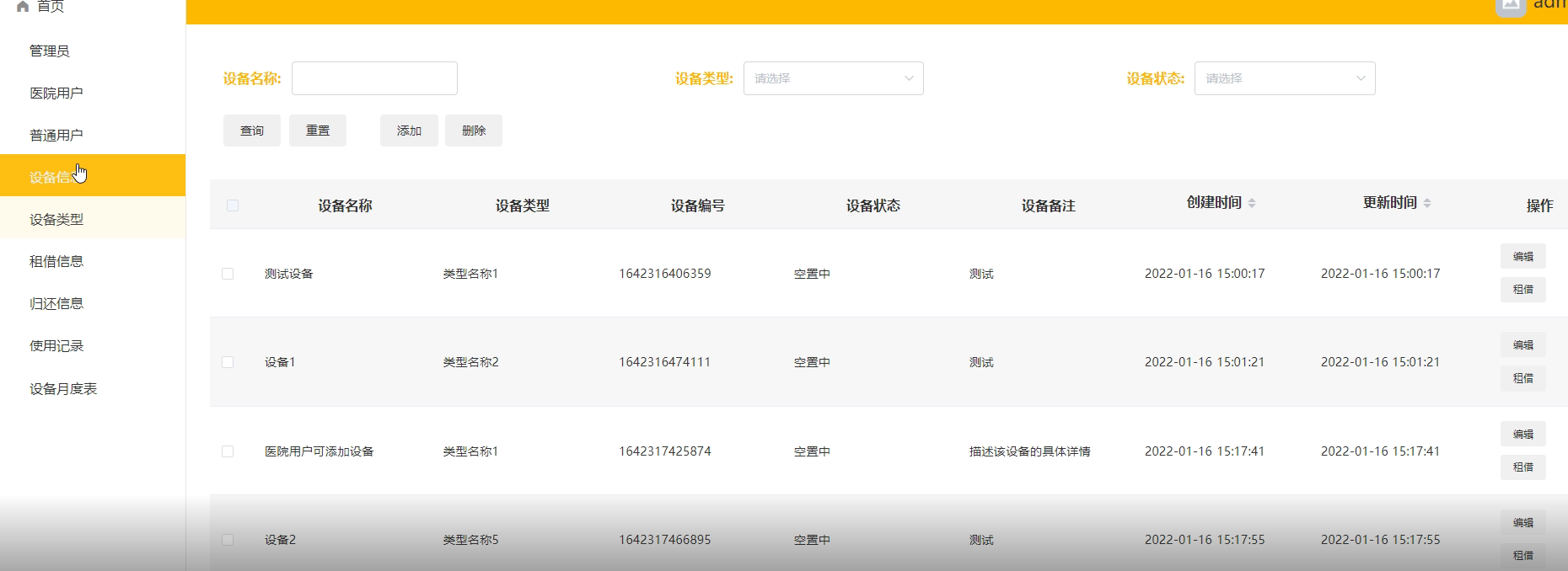 租借信息管理:对用户租借设备信息进行维护管理。