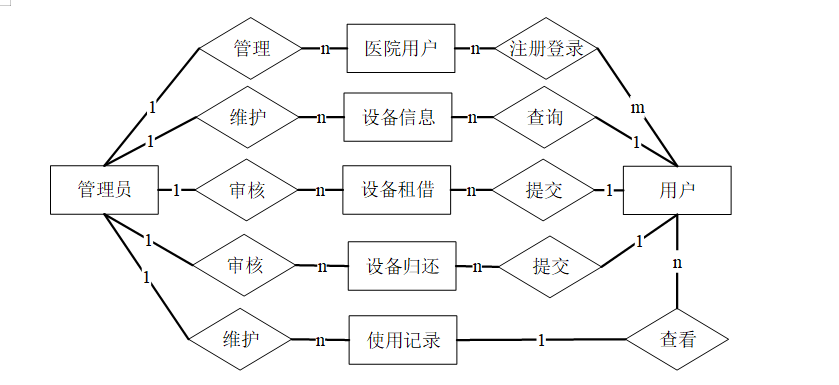 从前面可以分析到数据库中最重要的是医院用户信息,用户信息,设备信息,同时存在租借信息和归还信息。分析可以得到如下数据描述: