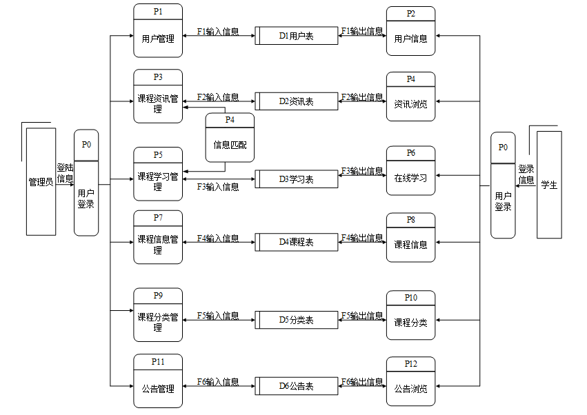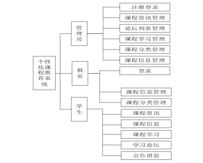 个性化课程推荐系统的功能主要分为台用户根据自己的需求进行注册登录,学生浏览课程资讯,课程学习,课程信息。老师进行课程信息管理、课程分类管理等,后台系统管理员主要对注册用户,课程资讯数据,课程分类、课程学习进行管理维护。