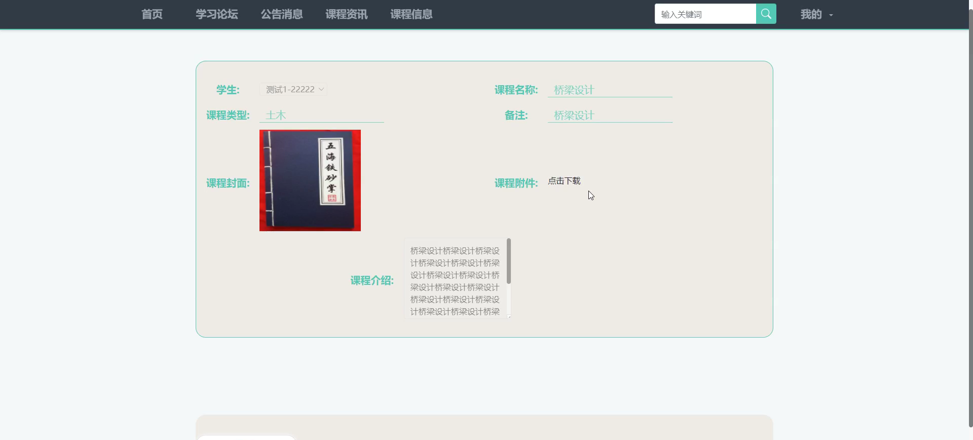 | 点击搜索课程信息,输入存在的课程信息名 | 查找出课程信息 | 与预期结果一致 |