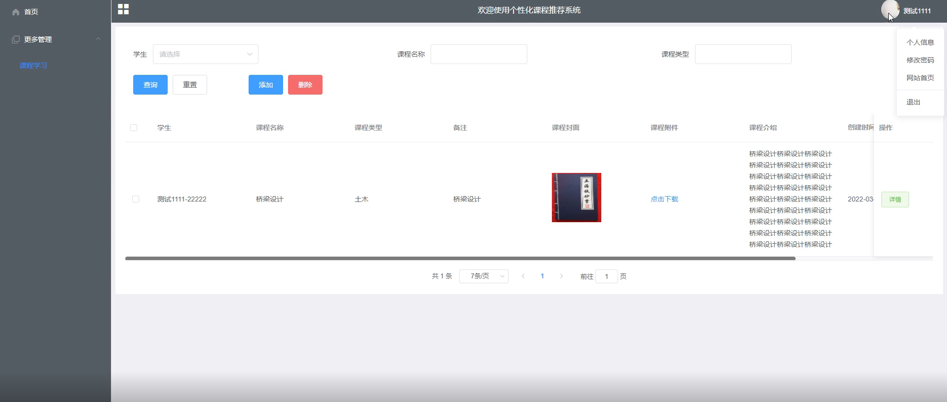 下表是课程学习管理功能的测试用例,检测了课程学习管理中对课程学习信息的增加,删除,修改,查询操作是否成功运行。观察系统的响应情况,得出该功能也达到了设计目标,系统运行正确。