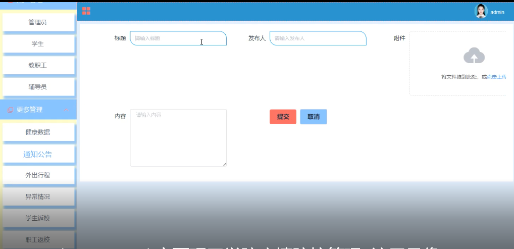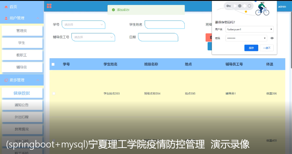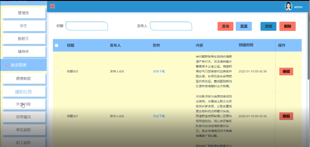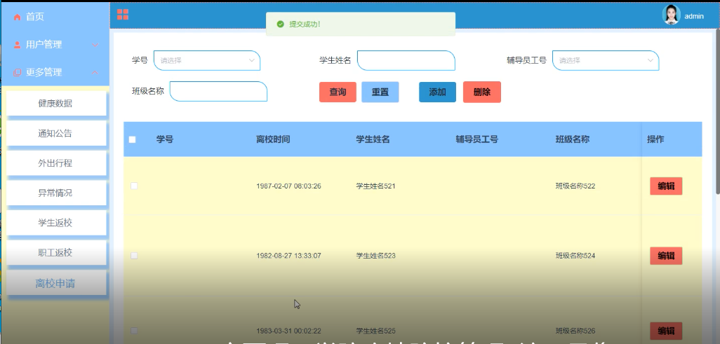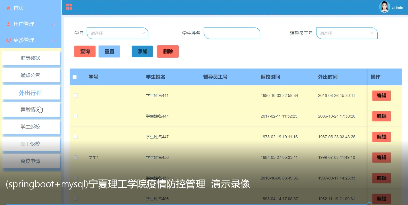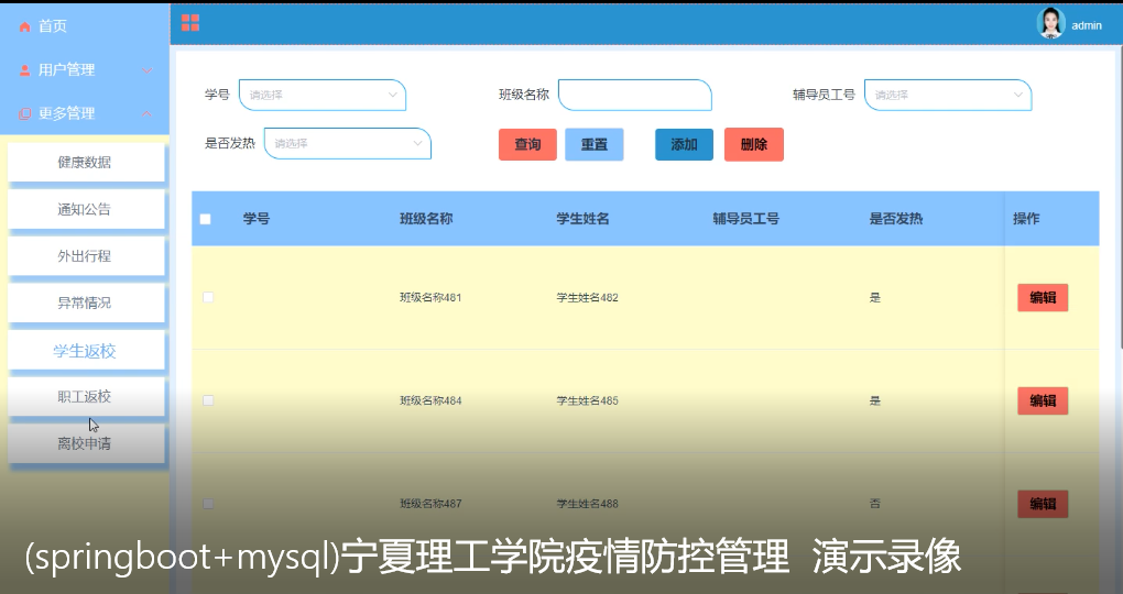 学生返校信息管理:对学生返校信息进行维护,添加、删除、修改信息。
