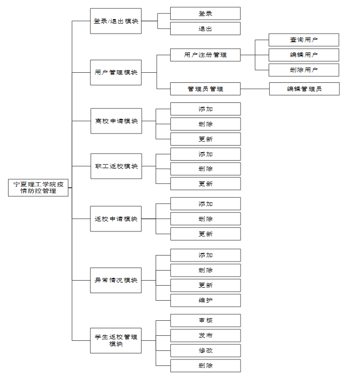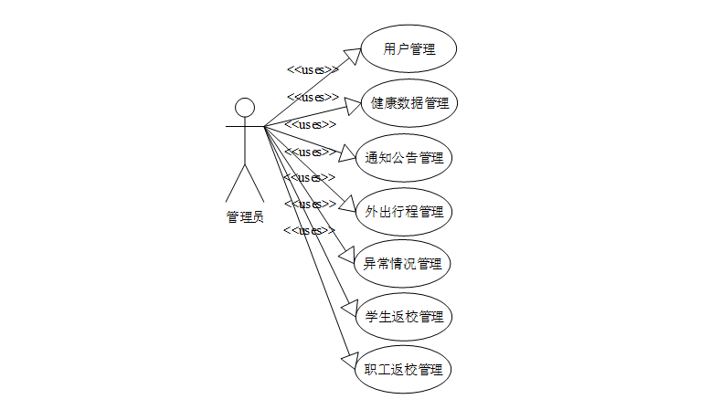 疫情防控管理信息系统的功能主要分为前台用户根据自己的需求进行注册登录,浏览检测机构信息并对选中的检测机构进行核酸预约操作。后台系统管理员因职责的不同,管理员主要对用户管理、健康数据管理、通知公告管理、外出行程管理、异常情况管理、学生返校、职工返校、离校申请管理进行处理。