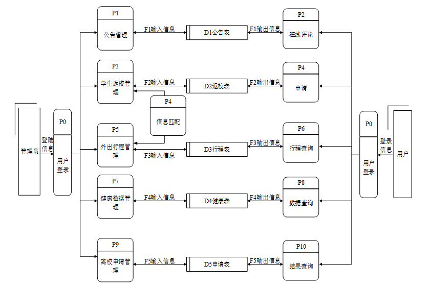 外出行程:存储用户的外出行程信息。包括外出行程的用户编号、用户姓名、类别、外出时间、外出地点、返校时间、备注等数据项。