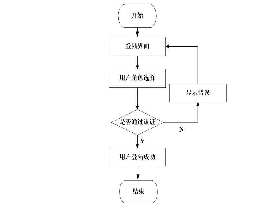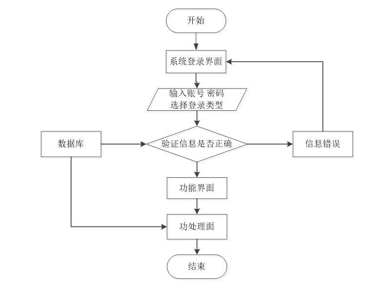 用户想进入系统,首先进入系统登录界面,通过正确的用户名、密码,选择登录类型登录,系统会检查登录信息,信息正确,然后输入相应的功能界面,提示信息错误,登录失败。系统操作流程如图3-4所示。