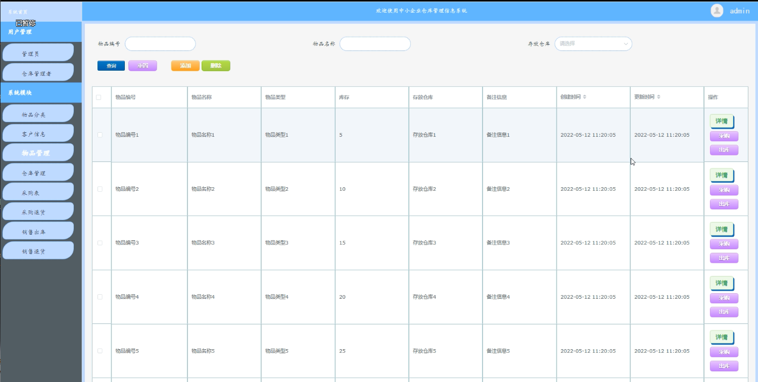 | 测试目的 | 检测物品管理管理时的各种操作的运行情况 | |