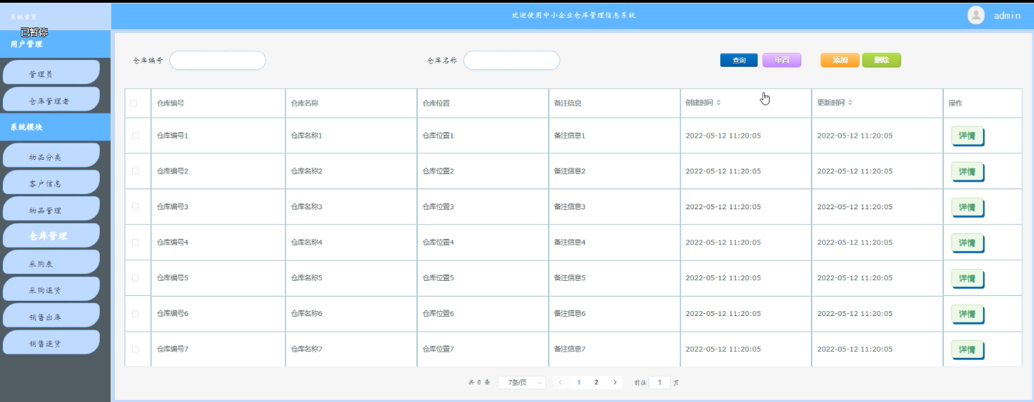 下表是仓库管理功能的测试用例,检测了仓库管理的操作是否成功运行。观察系统的响应情况,得出该功能也达到了设计目标,系统运行正确。