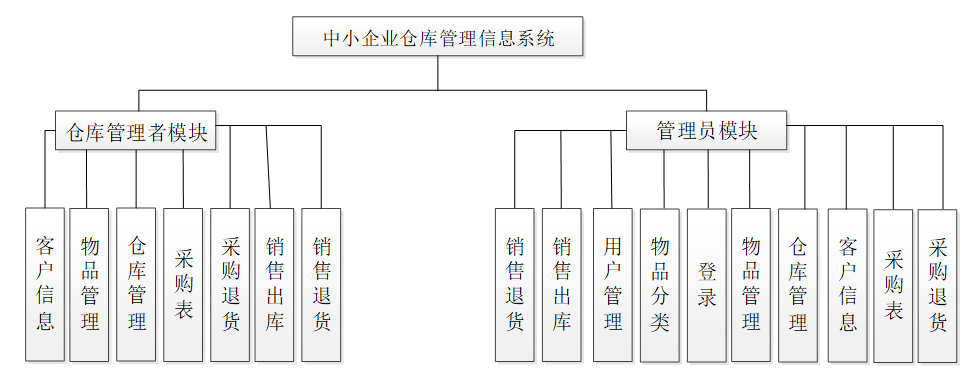基于中小企业仓库管理信息系统的设计基于现有的电脑,可以实现管理员,用户管理、物品分类、客户信息、物品信息、仓库管理、采购表、采购退货、销售出库、销售退货等详细的了解及统计分析。根据系统功能需求建立的模块关系图如下图: