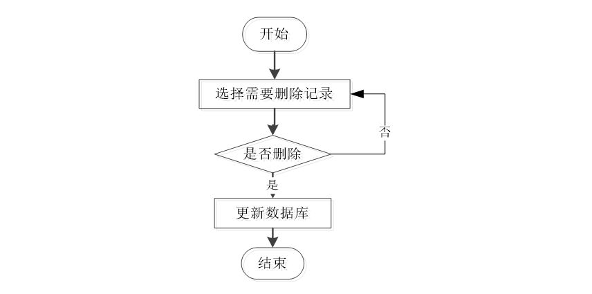 用户选择要删除的信息并单击Delete按钮。系统提示是否删除信息。如果用户想要删除信息,系统将删除信息。系统数据库删除信息。删除信息流程图如图3-5所示。