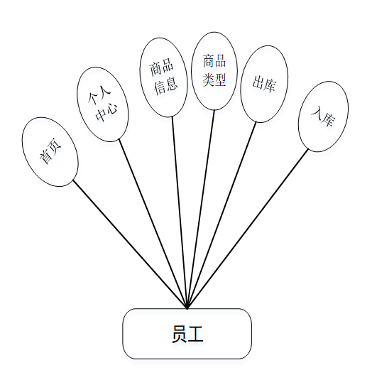 (2)员工:首页、更多管理(仓库、商品类型、商品管理、入库、出库)等功能。用户用例图如图3-2所示。