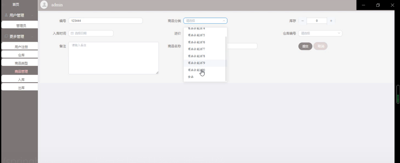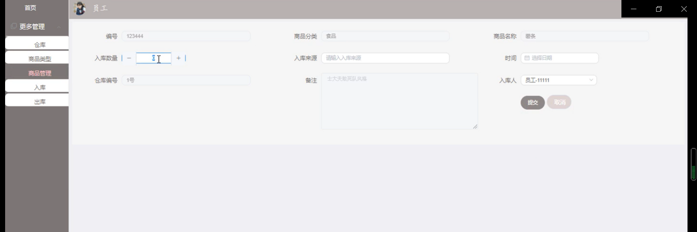 入库页面,员工登录系统,在入库页面输入商品编号、商品名称、商品分类、价格、总金额、数量、供应商、入库类型、入库人等提交信息如图5-6所示。