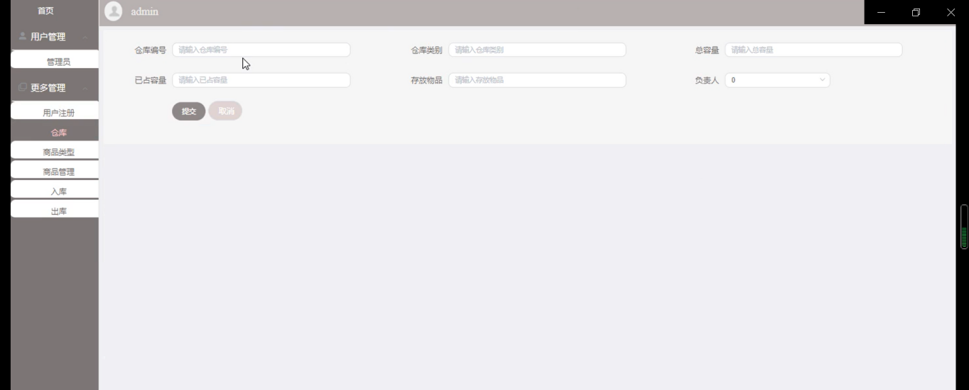 仓库信息管理页面,在仓库管理页面填写仓库编号、仓库类别、总容量、已占容量存放物品、负责人号等信息完成添加仓库信息录入,如图5-5所示
