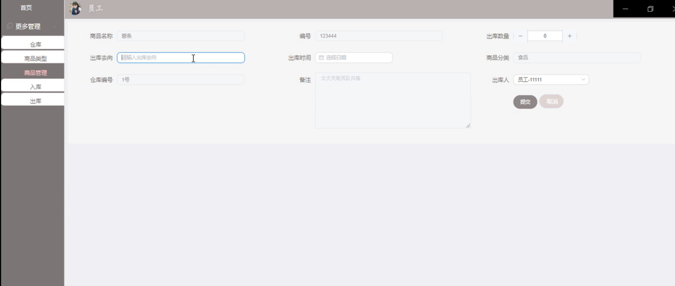 出库页面,员工登录系统,在出库页面输入商品编号、商品名称、商品分类、仓库编号、数量、出库去向、出库人等提交信息如图5-7所示