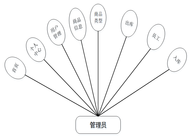 (1)管理员模块:系统中的核心用户是系统管理员,管理员登录后,通过管理员菜单来管理后台系统。主要功能有:首页、用户管理(管理员)更多管理(用户注册、仓库、商品类型、商品管理、入库、出库)等功能。管理员用例图如图3-1所示。