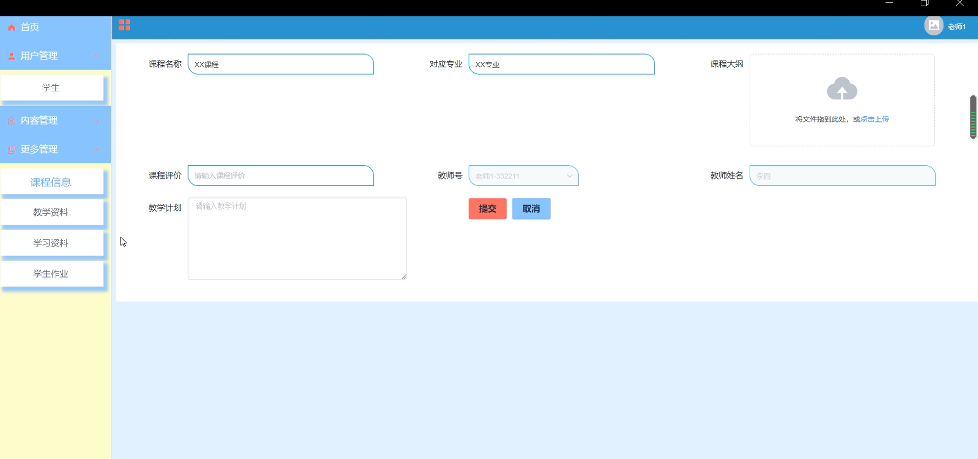 课程管理模块:课程管理分为课程添加、修改和课程学习。课程信息由教师进行修改、添加、删除操作;课程学习由学生来执行。