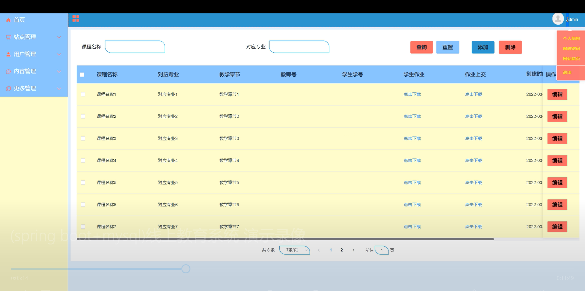 线上教育系统总体分为前台用户模块和后台管理员模块。
