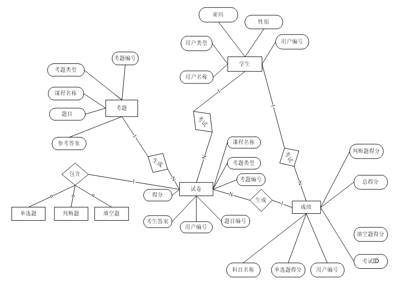 试卷:存储用户的试卷信息。包括试卷的试卷编号、课程名称、单选题、判断题、填空题、开始日期、结束日期等数据项。