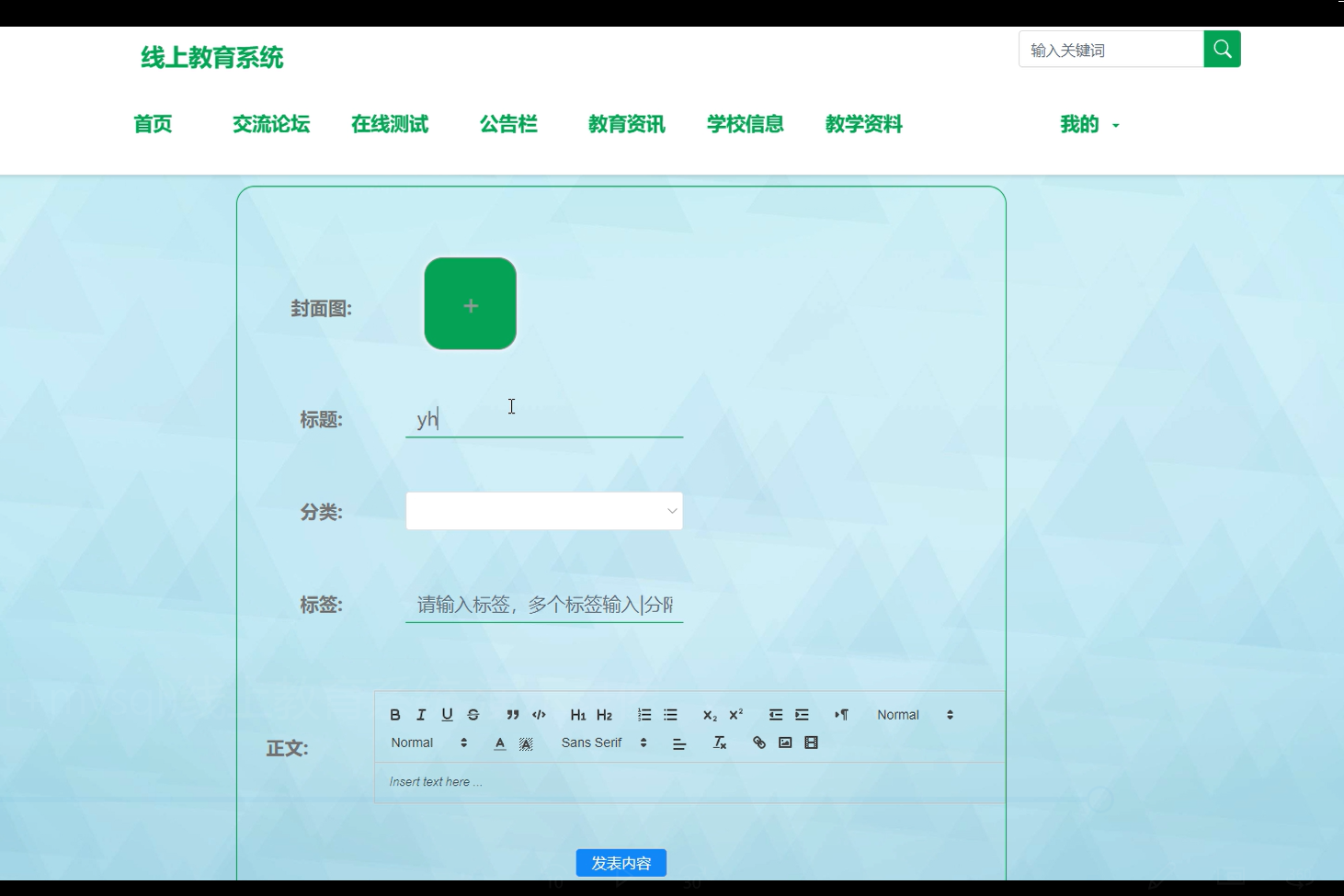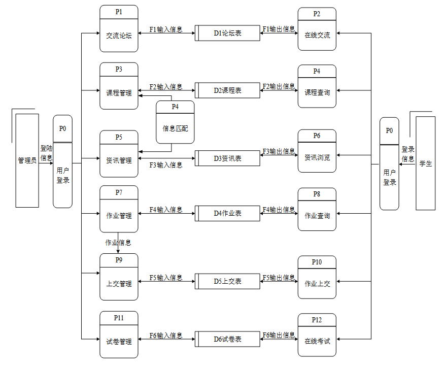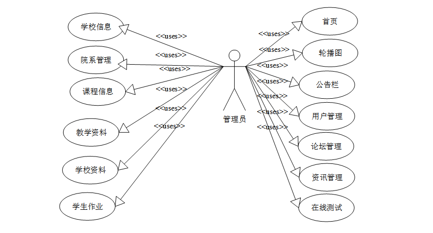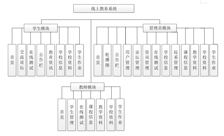 线上教育系统的功能主要分为前台用户根据自己的需求进行注册登录,浏览课程信息并对选中的教学资源进行学习操作。后台系统管理员因职责的不同,分为教师和管理员,教师主要对学生管理、在线测试、课程信息、教学资料、学校资料、学生作业,而管理员主要对学生,教师,考交流论坛、论坛分类、交易资讯、资讯分类、在线测试进行处理。