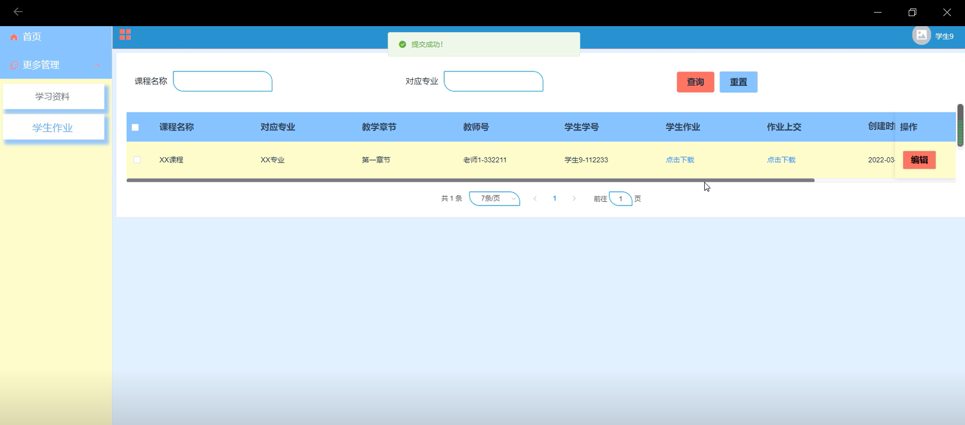 课程作业上交:学生根据自己的需求选中某个课程作业进行上交操作。