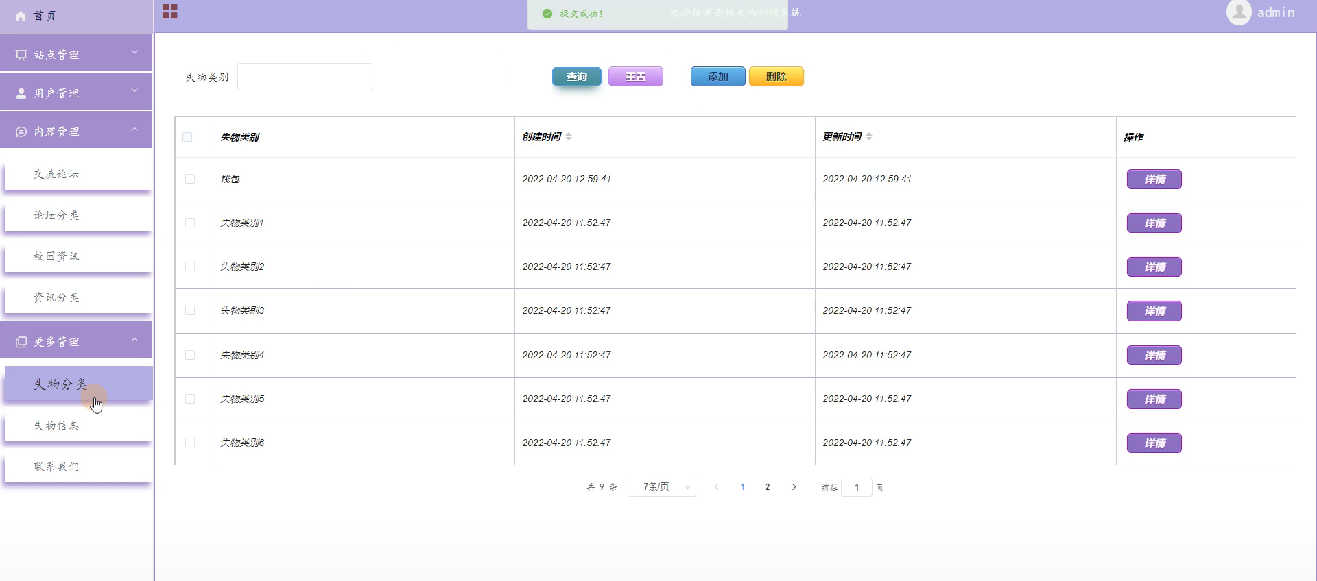 失物分类管理:对失物信息进行分类维护,添加、删除、修改信息。