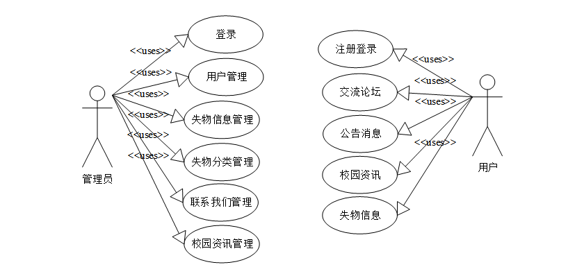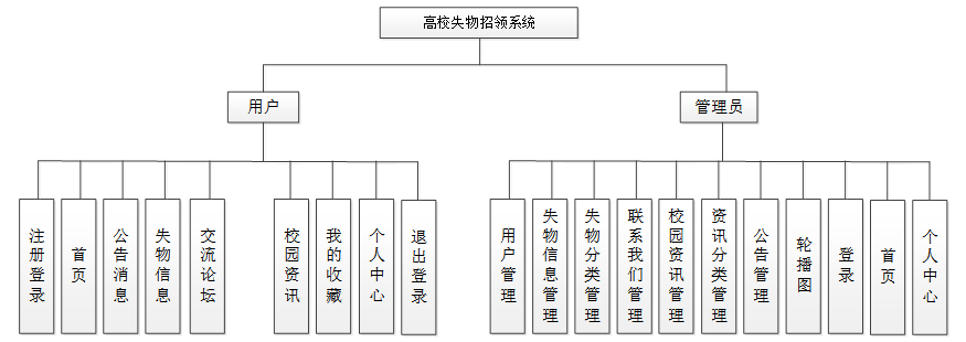 高校失物招领系统的功能主要分为前台用户根据自己的需求进行注册登录,浏览失物信息。后台系统管理员对失物发布单进行处理,对注册用户,失物信息、失物分类进行管理。