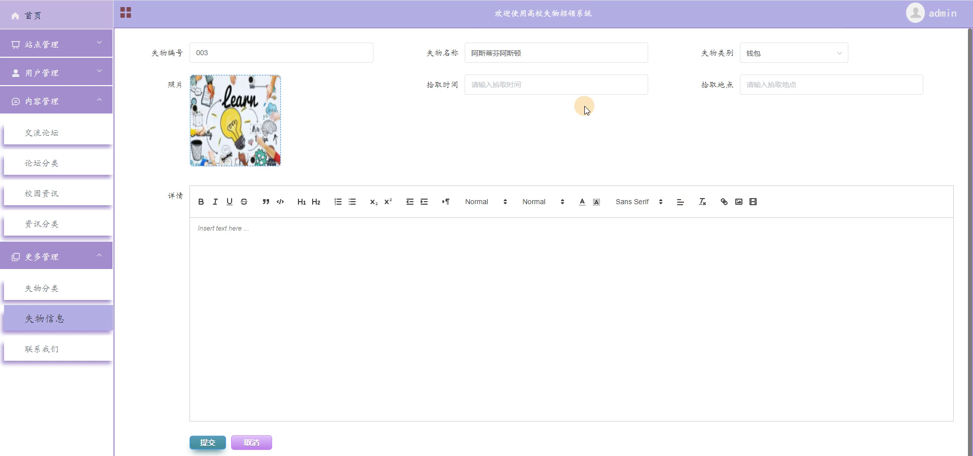失物信息管理:对失物信息进行维护,添加、删除、修改信息。