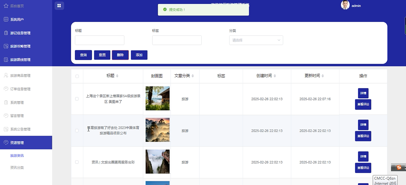 资源管理:发布和管理旅游相关的资讯内容,支持分类管理和标签标注。提升资讯检索效率,满足用户多样化需求。