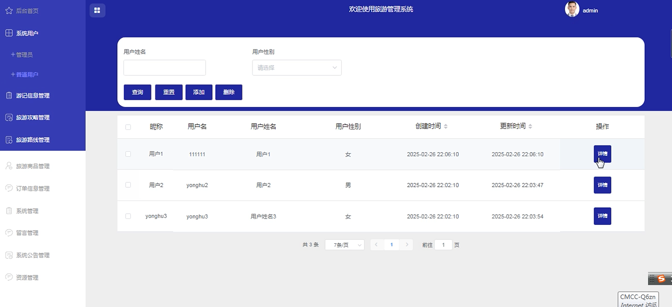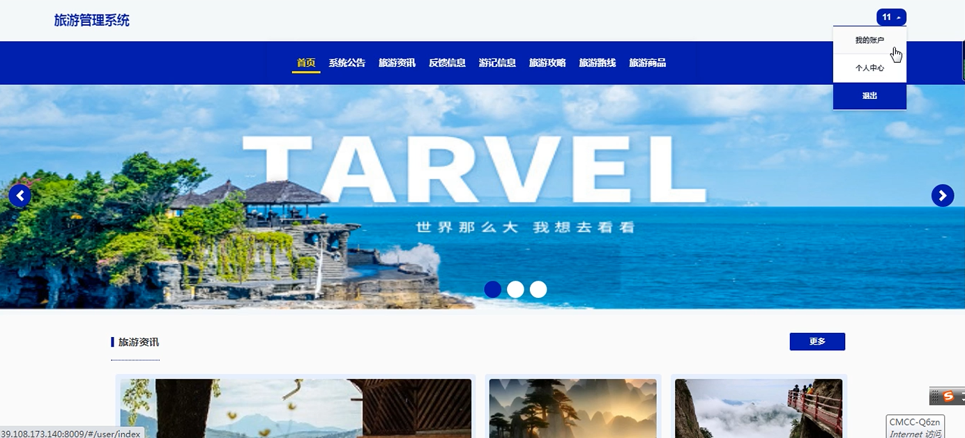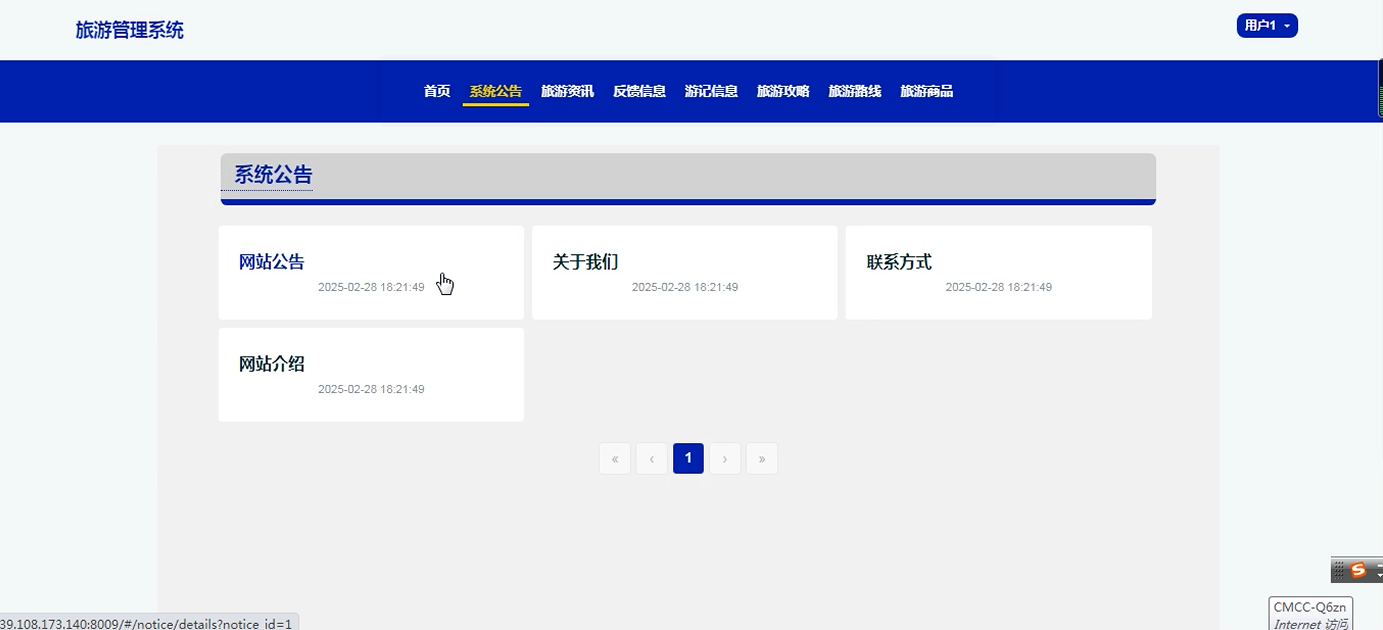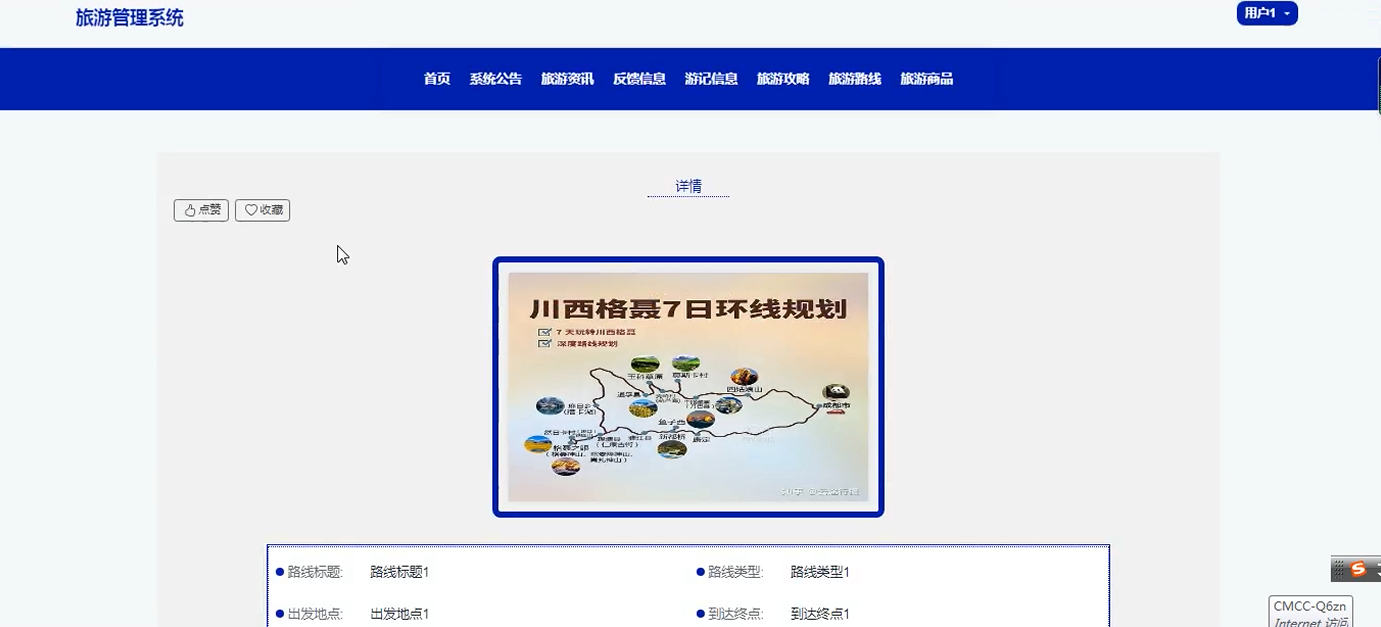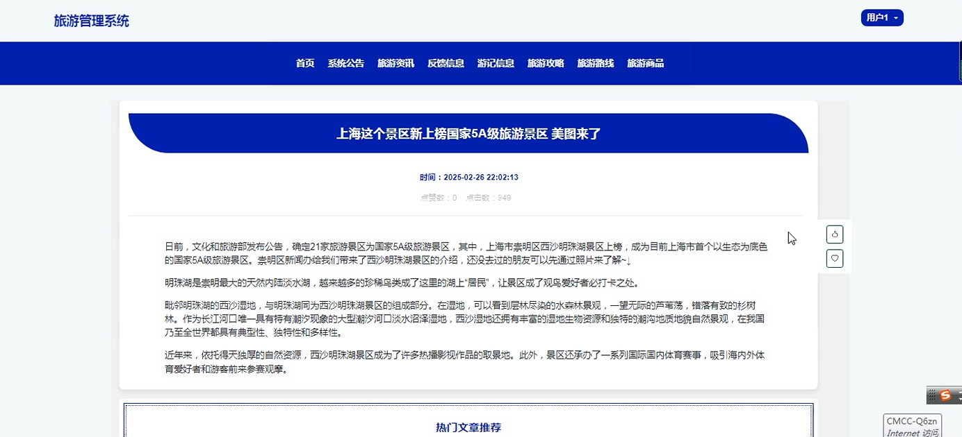 The system uses Spring Boot as the back-end framework, combined with Java language and MySQL database, to realize user management, travel record sharing, travel guide release, route planning, commodity sales and other functional modules. At the same time, Redis caching technology is introduced to optimize performance and enhance the usability and user experience of the system. The system also supports multi-role permission management to ensure data security and reliability. By building a unified information platform, it provides an efficient interactive experience for ordinary users and administrators, and improves the quality and efficiency of tourism services.
