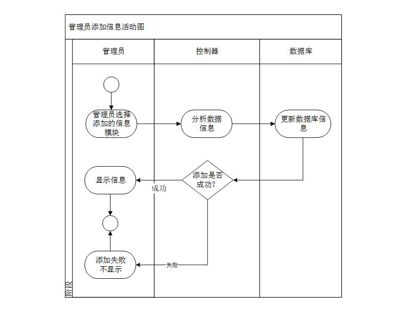 此活动图描述了管理员添加信息。管理员可以通过信息管理模块页面选择要添加的基本信息。添加成功传入数据库中,失败则不添加。管理员可以保存信息并更新系统中的信息。管理员添加信息功能的活动图如图3-4所示。