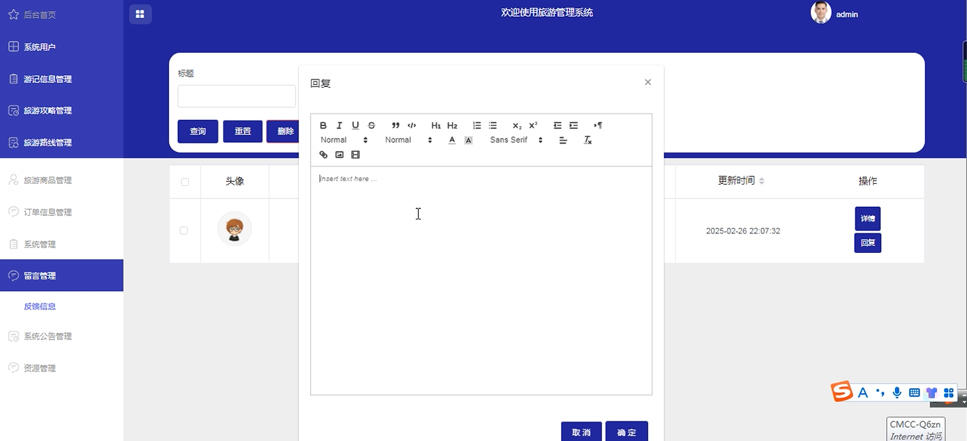 旅游攻略管理:发布和维护旅游攻略内容,包括标题、类型、推荐季节等字段。支持富文本编辑器,提升内容制作效率。
