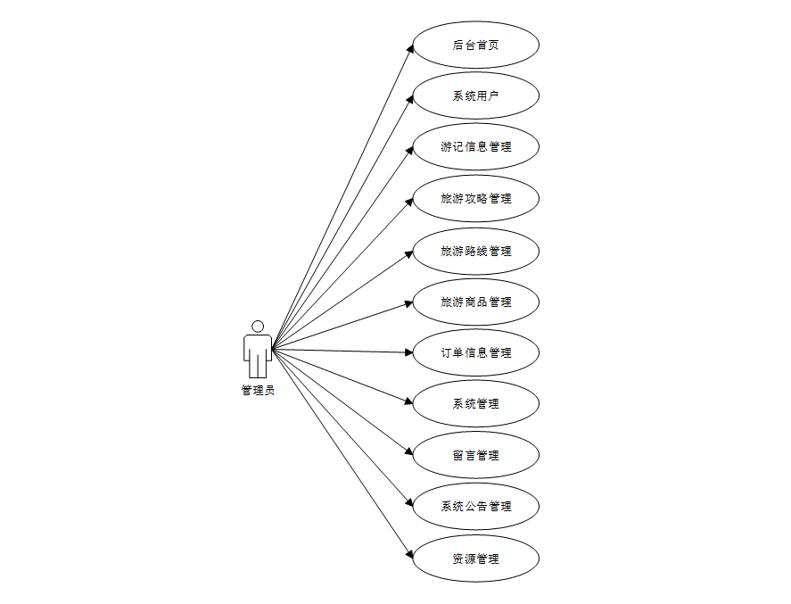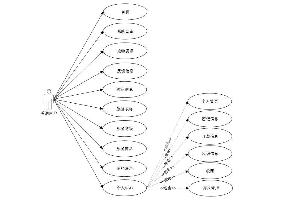 系统用例分析是对旅游管理系统中各个功能模块的用户需求和行为进行分析,以识别和描述不同的用户用例。通过系统用例分析,可以深入了解用户在系统上的操作流程和交互方式,为系统设计和开发提供指导,并确保系统能够满足用户的需求和期望。