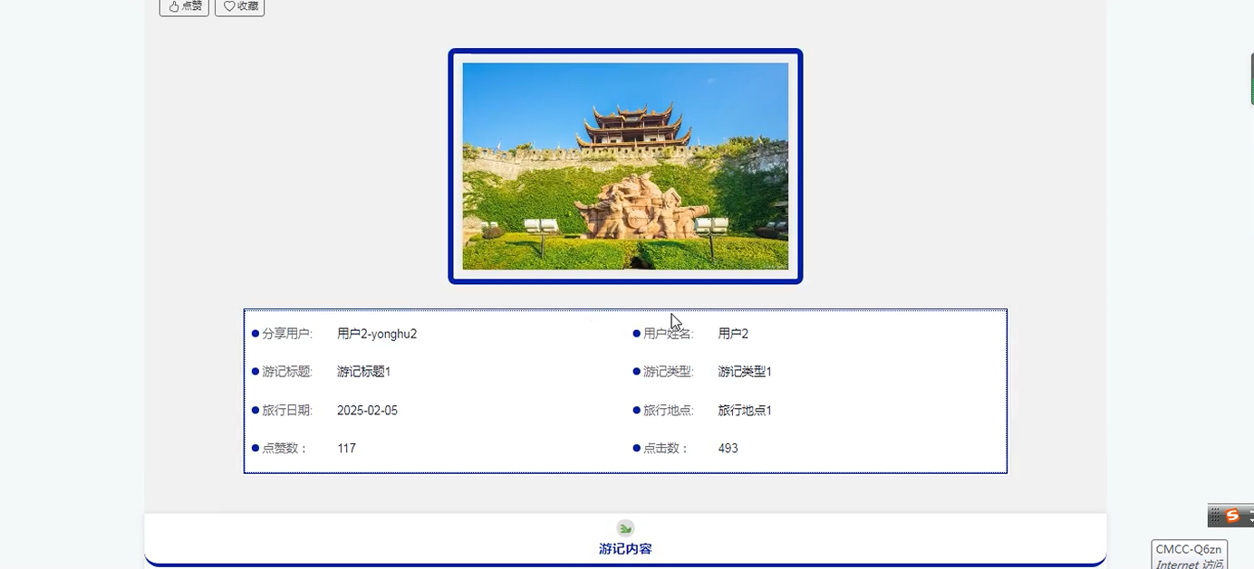 游记信息:浏览其他用户的游记分享,包含旅行地点、日期和体验等内容。支持点赞、收藏和评论互动,增强用户参与感。