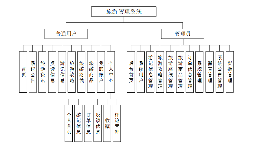 本系统旨在满足普通用户和管理员在旅游管理中的多样化需求,提供全面的功能支持。针对普通用户,系统涵盖游记分享、攻略浏览、路线规划、商品购买等模块,以提升用户体验;对于管理员,则提供用户管理、数据统计、内容审核等功能,确保平台高效运营与维护。具体功能描述如下: