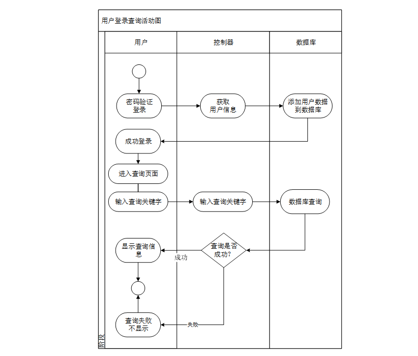 用户注册登录,系统从数据库获取用户数据信息,登录成功用户进入查询页面,用户输入查询关键字,数据库查询用户所输入的关键字,查询成功显示查询的模块信息,查询失败不显示。用户登录查询功能的活动图如图3-3所示。