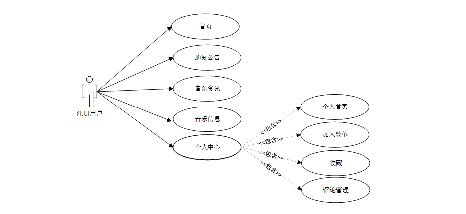 系统用例分析主要围绕用户和管理员的核心功能展开,明确不同角色在系统中的操作流程和交互方式。用户主要涉及注册登录、音乐浏览、个性化推荐、播放下载、收藏管理、评论互动等功能;用例分析有助于梳理系统的功能结构,优化用户体验,并提升管理效率。用户角色用例图如下: