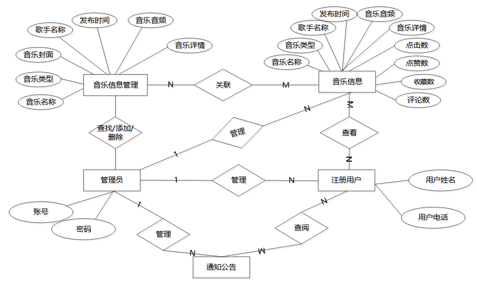 本文在系统分析阶段就抽取了一些实体,根据实体之间的关系,经过分析进行系统E-R图的设计。下面是整个音乐推荐系统中主要的数据库表总E-R实体关系图。