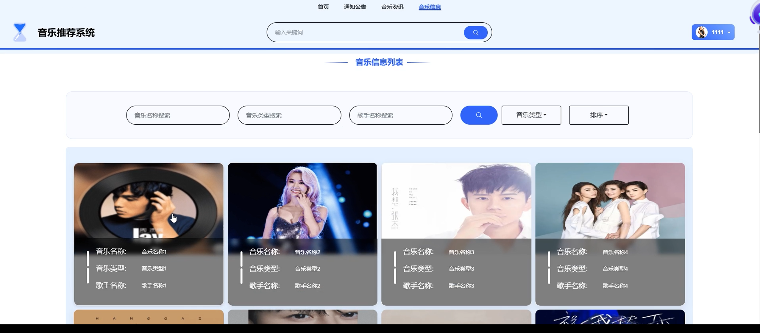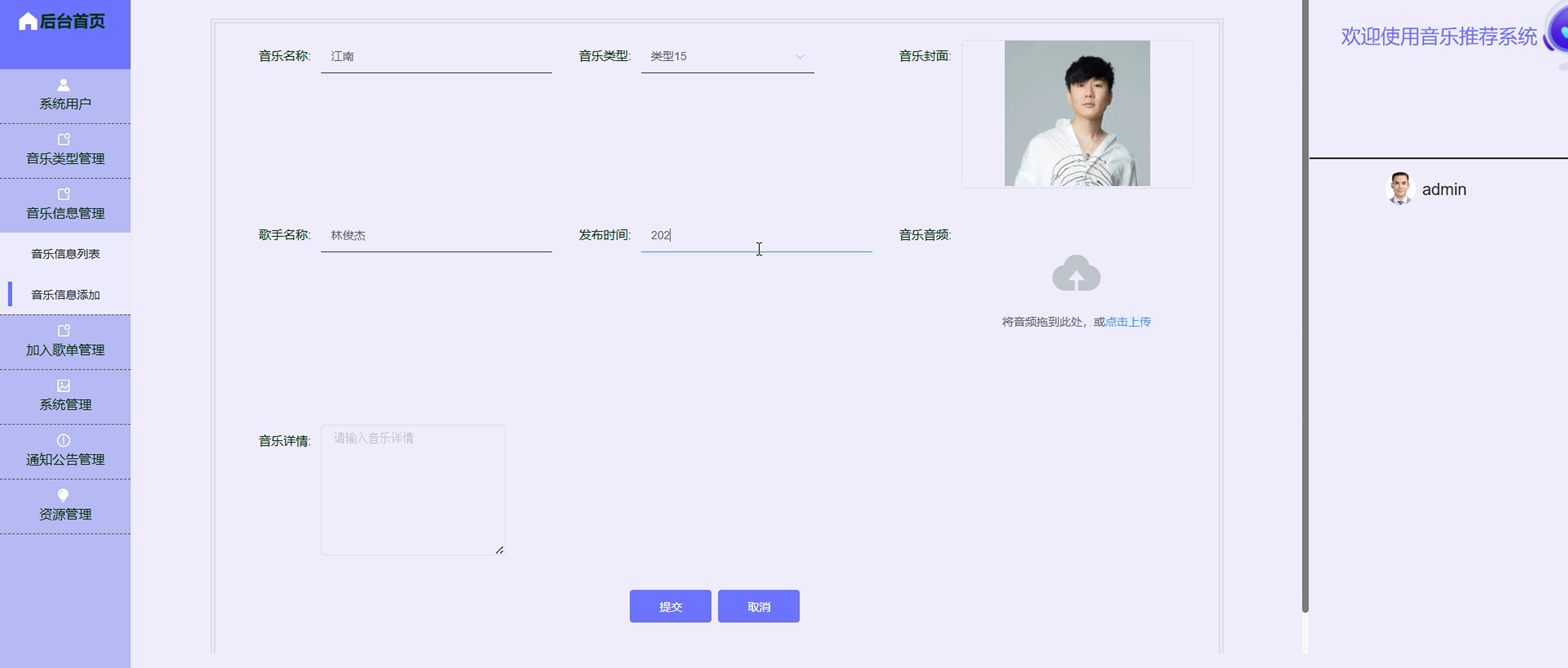 - 音乐信息管理:支持管理员添加、编辑、删除音乐信息,包括音乐名称、类型、歌手、封面、音频文件等。