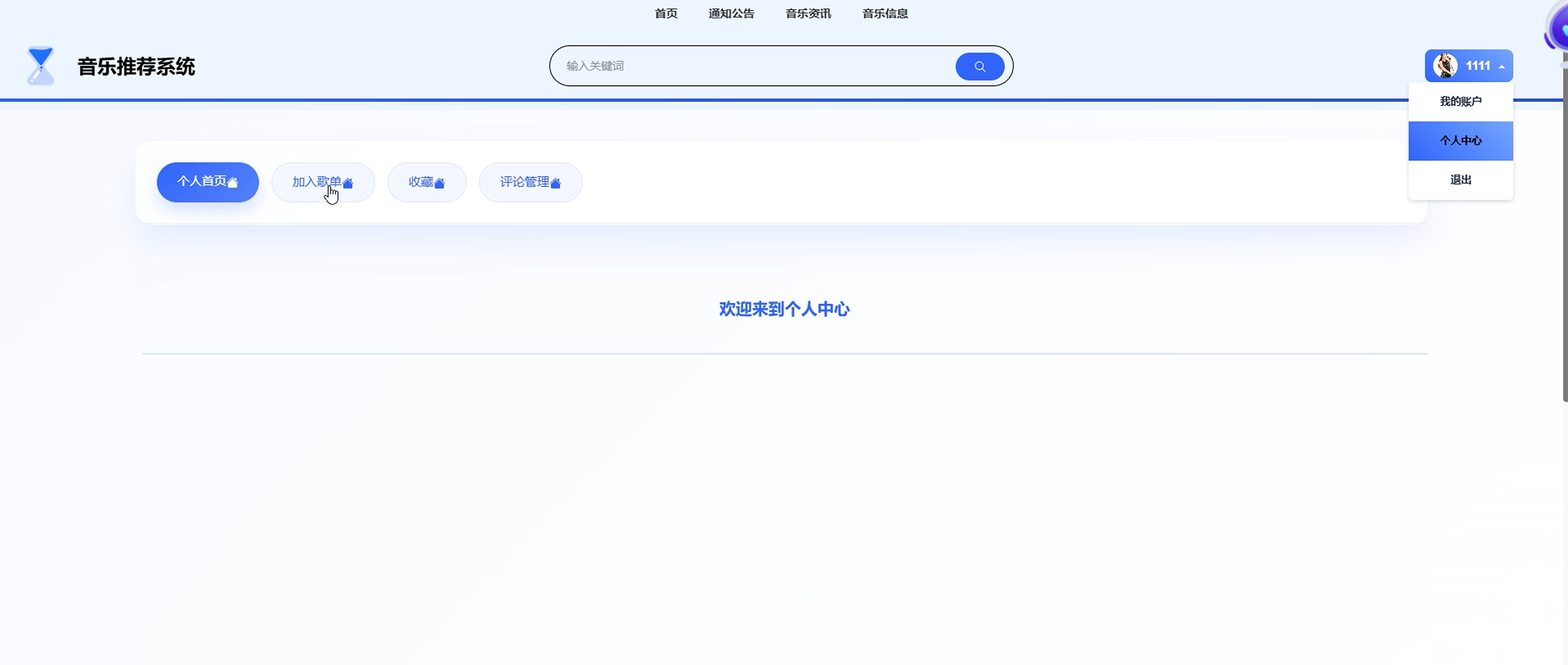 个人中心界面包含个人首页,支持管理歌单、收藏内容、评论互动,方便用户个性化管理和体验音乐。个人中心界面如下图5-8所示。