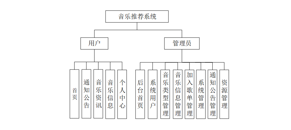 通过整体功能模块设计,将根据需求分析的结果,将系统的功能划分为不同的模块。每个模块负责实现特定的功能,并与其他模块进行协作。我们将详细定义每个模块的输入、输出、处理逻辑和相互依赖关系。音乐推荐系统功能模块图所示。