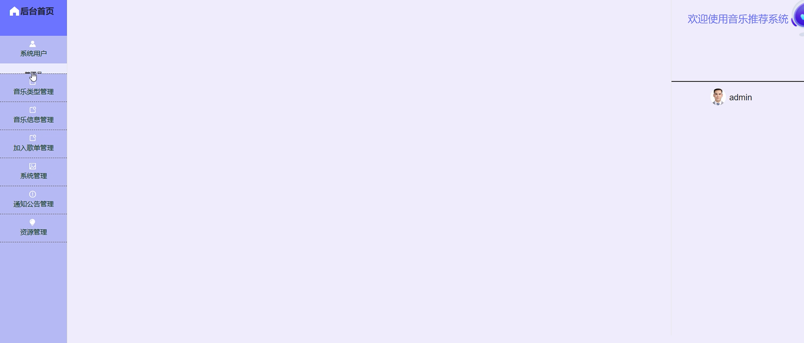 管理员首页界面提供系统管理入口,支持用户管理、音乐类型与信息管理、歌单管理、系统设置、通知公告发布及资源管理,确保平台高效运营。系统用户界面如下图5-9所示。