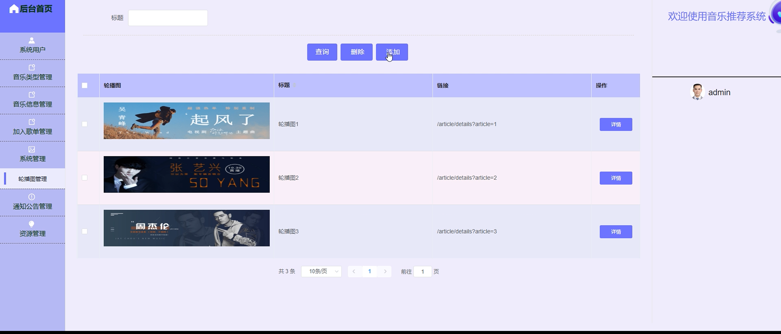 系统管理界面的轮播图管理功能支持添加、编辑、删除轮播图,确保首页展示的图片内容更新及时、美观协调,提升用户体验。系统管理界面如下图5-11所示。