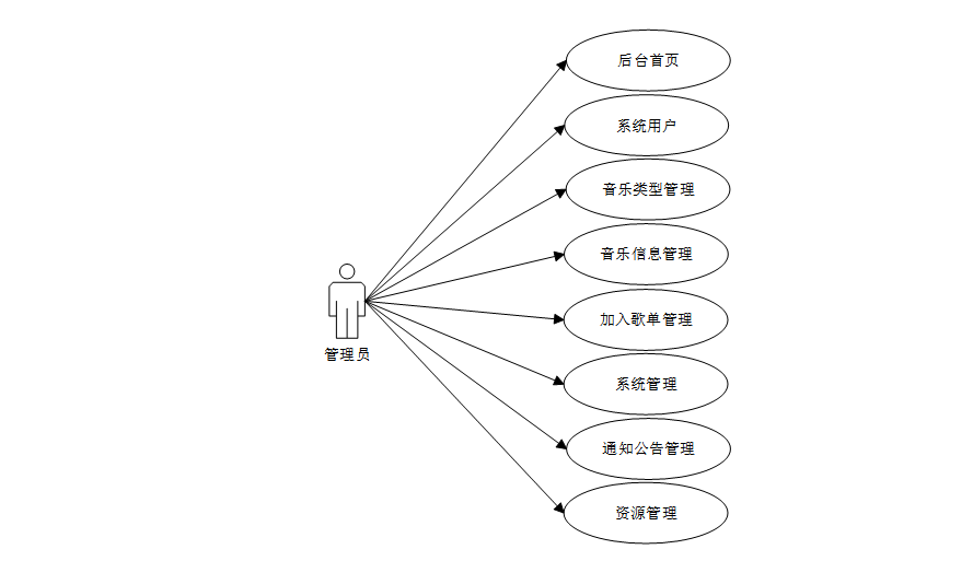管理员拥有系统的最高权限,负责整体运营管理及数据维护工作。管理员负责系统管理,包括用户管理、音乐信息管理、歌单管理、通知公告发布及评论审核等。通过这些用例,系统能够有效地满足不同角色用户的需求,实现个性化推荐与高效管理。管理员角色用例图如图3-2所示。
