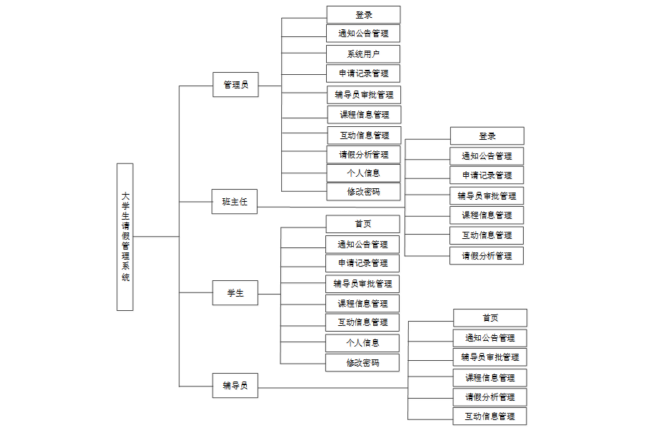 大学生请假管理系统从角色上划分为了管理员、班主任、辅导员以及学生用户四种角色。